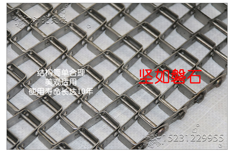 長城網(wǎng)帶材質(zhì):有A3低碳鋼、45#鋼、1Cr13耐熱鋼、 不銹鋼、304不銹鋼、1Cr18Ni9Ti不銹鋼、0Cr18Ni14NO2CU2耐熱耐酸鋼等